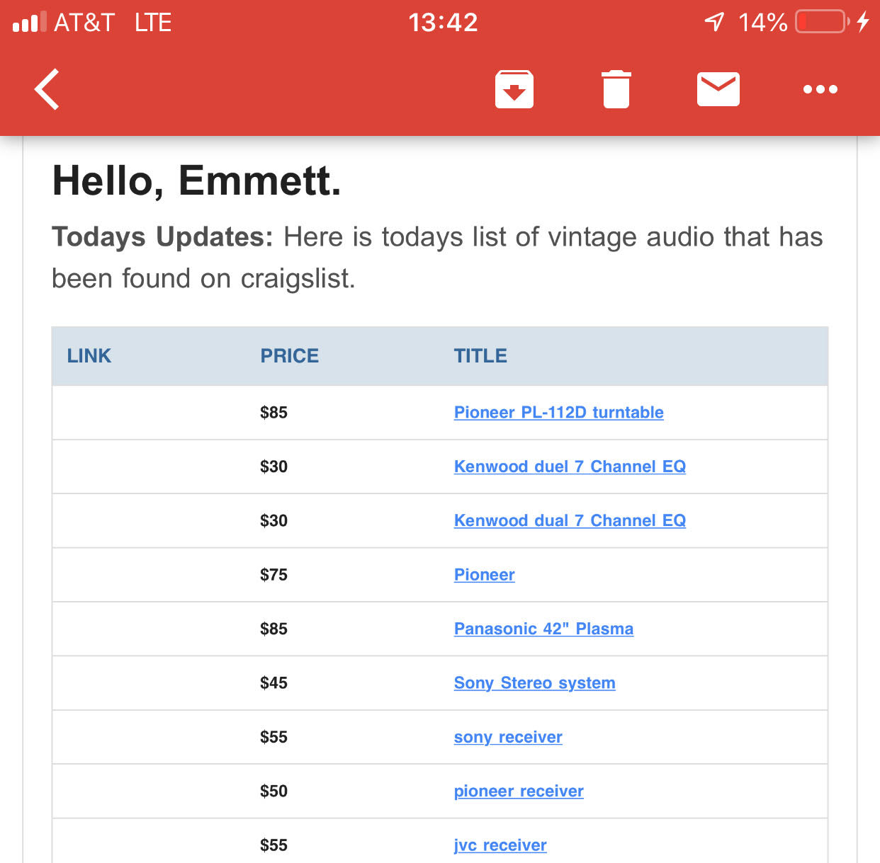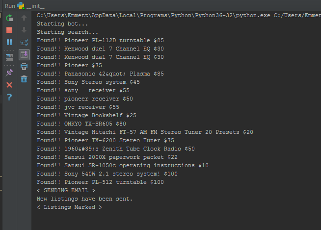 Python web bot that automatically searches a local craiglist for items based on specified parameters. I originally built this to find deals on vintage audio equitment.